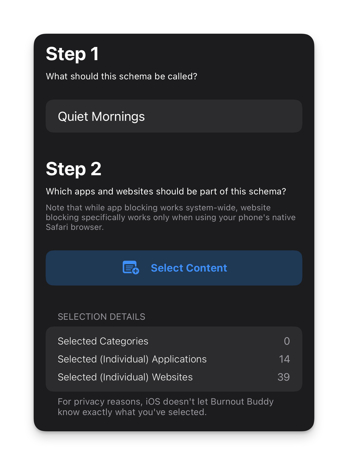 - For this schema I don’t have a daily usage limit as this is purely for blocking apps and websites in the morning.